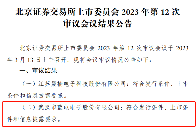 在3月13日召开的北交所2023年第12次审议会议上,武汉蓝电(830779)过会。