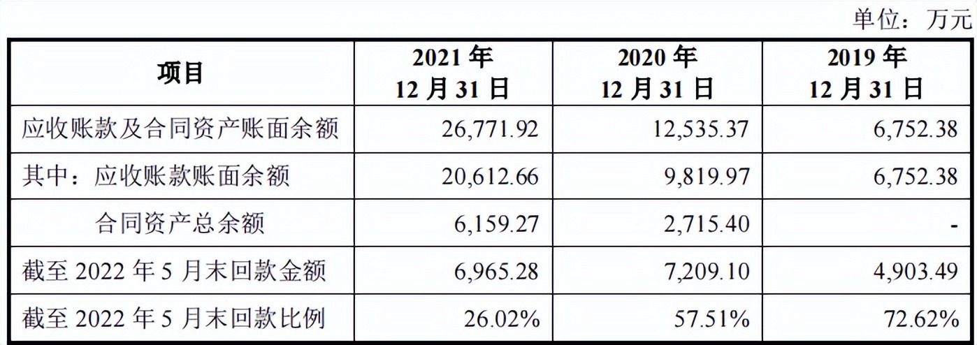 截至2022年5月31日,公司2019年末、2020年末及2021年末的应收账款及合同资产已回款金额分别为4,903.49万元、7,209.10万元和6,965.28万元,回款比例分别为72.62%、57.51%和26.02%,回款比例较低主要因为疫情反复爆发,客户资金安排放缓。