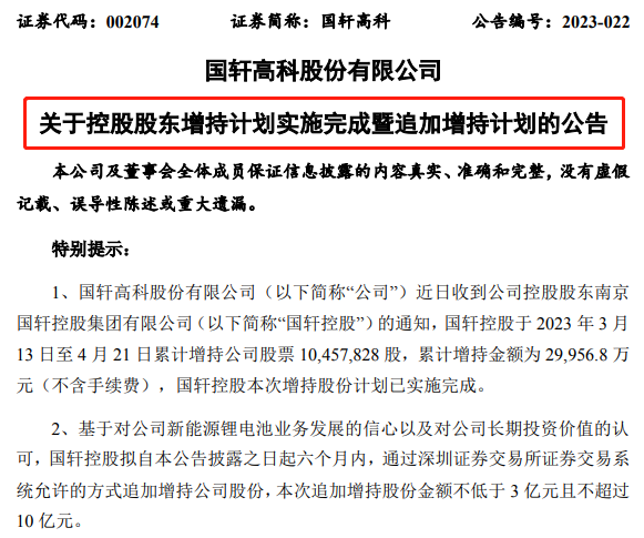 4月24日晚,国轩高科(002074)发布了《关于控股股东增持计划实施完成暨追加增持计划的公告》。