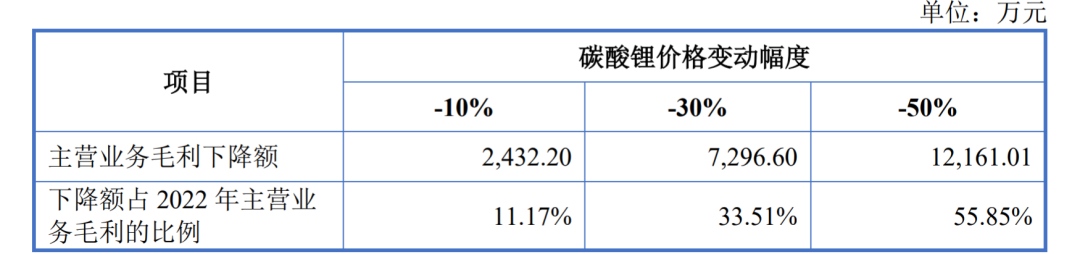 受到碳酸锂价格下跌影响,吉锐科技主营业务毛利率从2021的41.13%下降至23.52%。吉锐科技在招股书中也指出,若碳酸锂价格下跌幅度达到30%-50%,公司主营业务毛利润2023年毛利可能较2022年下降33%-55%不等。