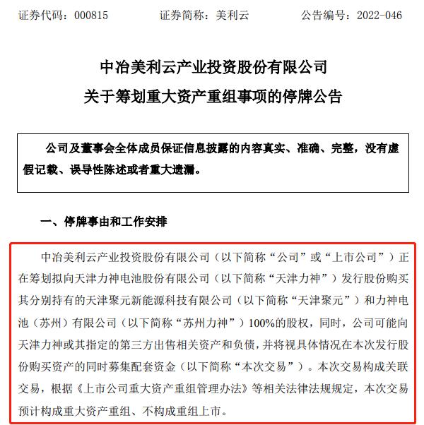 10月31日,美利云发布《关于筹划重大资产重组事项的停牌公告》称,公司正在筹划拟向天津力神发行股份购买其分别持有的天津聚元和苏州力神100%股权。