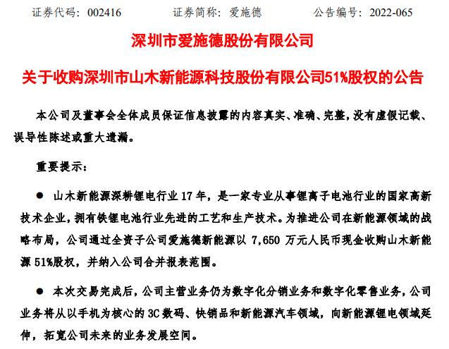 11月7日晚,A股上市公司爱施德(002416.SZ)发布公告称,为进一步推动公司在新能源领域的战略布局,公司于11月6日审议通过了《关于收购深圳市山木新能源科技股份有限公司51%股权的议案》,公司将通过全资子公司爱施德新能源,以7650万元人民币现金收购山木新能源51%股权。