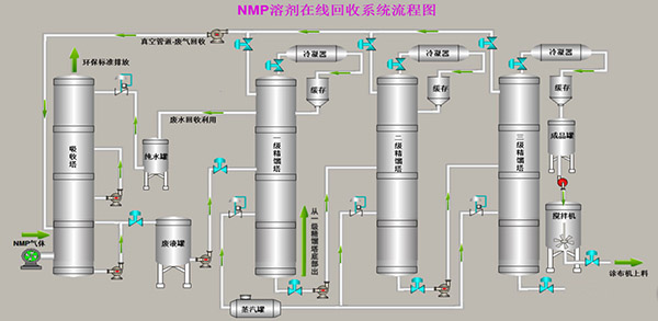 在锂电池生产中,NMP用于正极涂覆制浆工序,溶解正极材料、PVDF粘结剂等,浆料涂覆到正极片经烘干,溶剂NMP又可全部挥发,经冷凝后收集回收,在经过精馏除杂得到可以重新利用的新液。