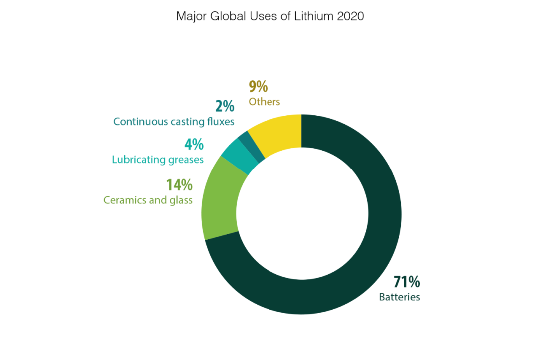 理论上看来,世界锂储量足以满足预期需求增长。然而,这一假设建立在这样一种前提之上,即所有储备都能投入生产,并且一切储备都被用于动力电池制造,只是现实并非如此——事实是,仅有少数公司能够生产高质量、高纯度的锂化工产品;同时,并非世界上所有的锂都被用于动力电池制造,其在笔记本电脑和手机、飞机、火车和自行车等制造中被广泛应用。2020年,用于电子产品、电动汽车和电网存储的可充电电池制造是全球锂最大的应用场景,占总需求的71%。