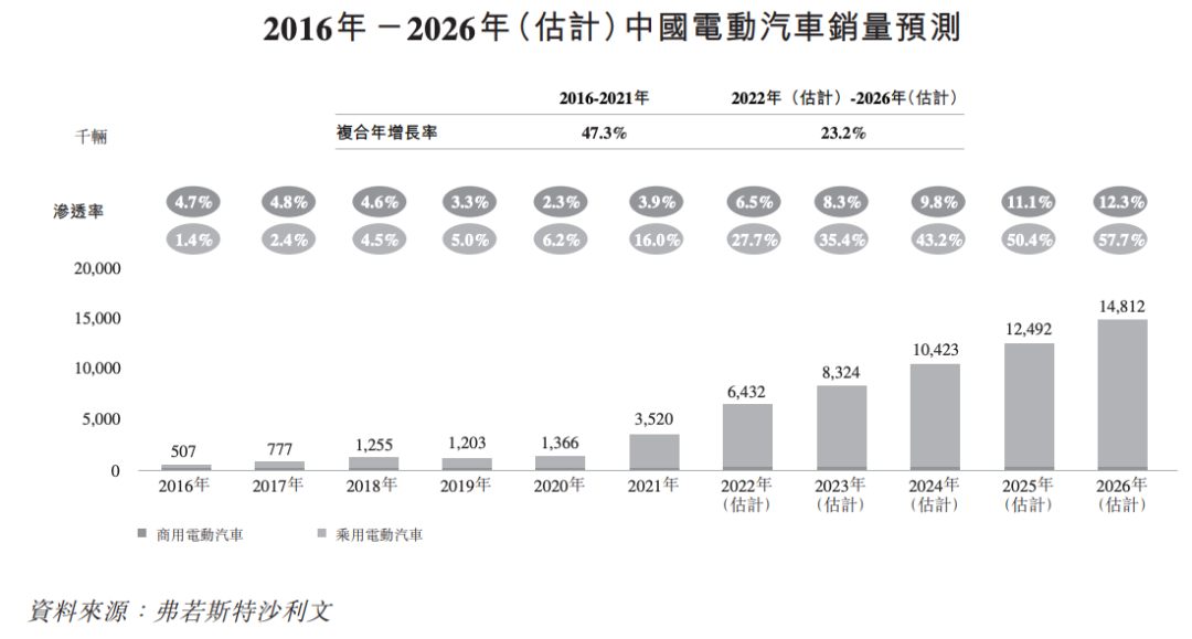 据弗若斯特沙利文数据显示,2021年中国是全世界电动汽车销量最高的国家,共为352万辆电动汽车,预期将于2026年达到1481.2万辆,2022年至2026年将按复合年增长率23.2%增长,乘用电动汽车及商用电动汽车的渗透率分别为57.7%及12.3%。