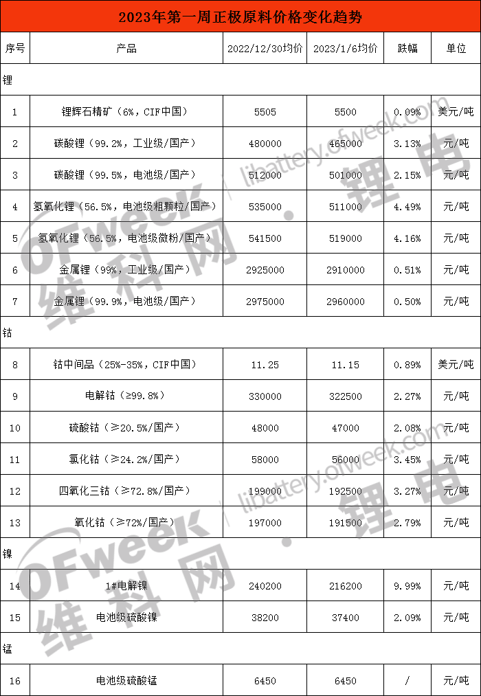 也就是说,2023年第一周,锂电原材料产品的价格,无一上涨。