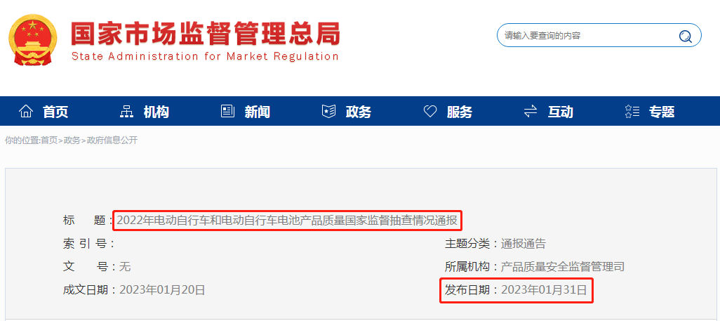 1月31日,国家市场监督管理总局发布了《2022年电动自行车和电动自行车电池产品质量国家监督抽查情况通报》(简称“通报”)。