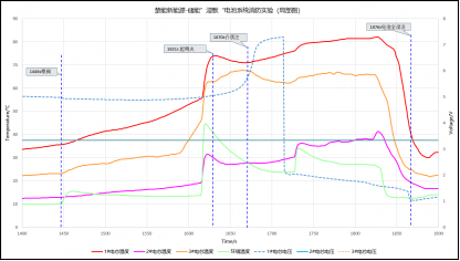 来自楚能新能源储能“浸默”电池安全系统解决方案实验现场的经过显示,开始充电并由于过充引发热失控(0秒)后,24.1秒引发电芯喷阀烟感器报警,27.2秒切断充电电源,27.8秒液体消防介质开始注入,30.5秒电池全浸没、明火熄灭,电池全浸没60分钟后温度下降至常温。
